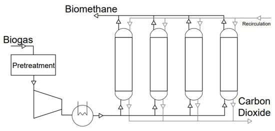 Raw biogas is first purified by eliminating hydrogen sulfide, VOCs, siloxanes, and H2O; then, it is pressurized and directed into an adsorption column where carbon dioxide is captured while methane passes through. After the column material is saturated with carbon dioxide, the pressure is decreased, which enables the carbon dioxide to be released and directed into an offgas stream. The columns’ operational cycle follows the Skarstorm cycle [], which includes four stages: pressurization, feed, depressurization, and purge, as can be seen in Figure 10a. Several columns are necessary for continuous flow in the batch process. The relationship between gas adsorption and pressure for a particular adsorbent is depicted in Figure 10b. An ideal adsorbent material should show a substantial difference between qfeed and qregeneration, taking into account the pressurization expenses, where q is the volume of CO2 that can be adsorbed at those conditions. Usually, to minimize methane loss, the gas released during the regeneration phase of a column is utilized to pressurize a cleaned column to take advantage of the remaining pressure and decrease the energy usage []. Increasing the number of columns can provide additional design possibilities to improve the system energy efficiency, but it also results in increased complexity and costs. A typical layout is showed in Figure 11. The adsorbent is a porous material created with a large specific surface area to improve gas interaction. Activated carbons, natural and manufactured zeolites, silica gels, carbon molecular sieves (CMSs), and MOFs are common adsorbent materials []. Effective adsorbent materials must have activity and selectivity for carbon dioxide, be non-toxic, and demonstrate long-term stability. There are two main types of adsorbent materials: equilibrium adsorbents, such as activated carbons and zeolites, and kinetic adsorbents, like Cu-MOF. The first material has a greater capacity for carbon dioxide adsorption than methane, while the second material adsorbs carbon dioxide at a faster rate, reducing the cycle time, as can be seen in Table 5. The gas produced during the blowdown process contains methane, which can be managed using several methods, such as a torch, RTO, or CHP system. The primary benefits of the PSA method include the lack of chemical issues and its dry nature, which eliminates the concern of contaminated wastewater. The primary drawback is the loss of methane and electricity usage. The electricity consumption of the PSA system for upgrading ranges from 0.15 to 0.3 kWh/Nm3 for raw biogas, with an additional 0.17 kWh/Nm3 for drying and the final compression of the output gas. Using a catalytic oxidizer increases the energy requirement, potentially reaching around 0.3 kWh/Nm3 [].