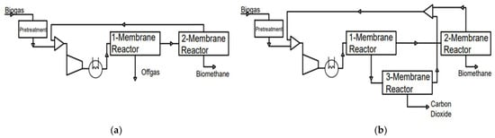 The penetration rate is primarily determined by the molecule size, the hydrophilicity of the molecules, and the pressure difference between the two side of the membrane. Polyimide and cellulose acetate-based membranes are identified as the most appropriate commercial membranes for separating biogas []. Before the membrane upgrading, all contaminants in the biogas must be removed to avoid membrane degradation, which could result in system shutdown and costly replacement. An activated carbon bed is frequently utilized to remove hydrogen sulfide, ammonia, siloxanes, and volatile organic compounds. After this pretreatment, the biogas is compressed to a pressure between 6 to 20 bar and then chilled to reduce the dew point and remove excess humidity []. The operating pressure varies in accordance with the CH4 purity, depending on the intake composition during operation. It is essential to check for any oil residue after compression, as contact between the membrane and oil can greatly reduce the membrane’s lifespan, which usually ranges from 5 to 10 years []. The biogas is directed into a membrane reactor composed of multiple membranes which are module connected in a series. Various membrane configurations have been studied [], but the two main types utilized by commercial plants are shown in Figure 13. In the configuration depicted in Figure 13a, the permeate from the first module is released while the retentate proceeds through a subsequent reactor. The permeate leaving the second reactor contains carbon dioxide with consistent traces of methane and is typically recirculated to the biogas compressor. The retentate stream contains methane with a purity usually exceeding 97%. This configuration can achieve methane recovery between 95% and 98% []. Figure 13b shows the second configuration with an extra reactor linked to the permeate of the first reactor. The third reactor produces offgas with a lower methane content, and the retentate is usually recirculated with the permeate from the second reactor. The alternative arrangement guarantees methane purity levels higher than 97% and methane recovery rates ranging from 99% to 99.5% []. Various membrane compositions offer a wide range of features as permeability or selectivity, as shown in Table 6, allowing for multiple designs. So, the membranes which have higher selectivity are used for the last separation step, and the membranes with higher permeability are chosen for the first stage of separation.