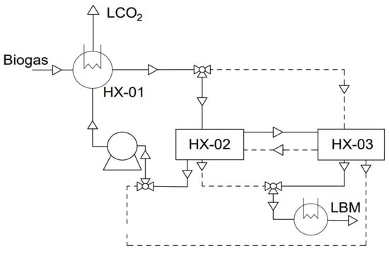 Prior to the upgrading process, the biogas needs to be cleaned and dehumidified. This last step is crucial to avoid the water freezing and damaging the equipment. Figure 14 shows the schematic of the process that mainly consists in a heat exchanger network: the main step is carried out with two or more heat exchangers with the same design to control the solidification of CO2. The heat exchangers HX-02 and HX-03 have the same configuration and during the process they switch between the sublimation and regeneration phase: Figure 14 shows heat exchanger HX-02 in the recovery phase and HX-03 in the sublimation phase. The dashed lines represent the streams when there is a reversal of the roles of the exchangers. During the regeneration phase, the biogas is precooled in the heat exchanger HX-01, heating up the solidified carbon dioxide and melting it into a liquid phase at the same time. The resulting biomethane is then cooled using an anti-sublimation heat exchanger to solidify the carbon dioxide and produce biomethane with a CO2 level of approximately 50 ppm. This approach has an advantage over the other cryogenic separation methods as it enables a lower methane content in solid CO2 than in liquid carbon dioxide, leading to decreased methane slip. The process is batch-oriented and requires heat exchangers to minimize the cycle time because of CO2 solidification, resulting in a significant increase in investment costs due to the specific heat exchanger design [].