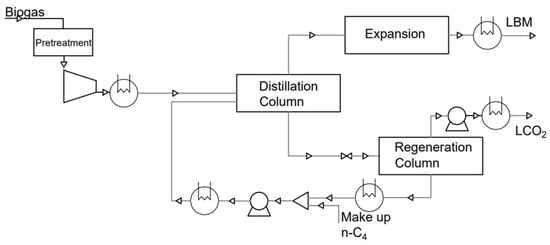 The biogas is pressurized to approximately 40 bar following an initial purification procedure and dehumidification. Heavy hydrocarbons, typically n-butane, are introduced into the extractive distillation column to prevent the solidification of carbon dioxide during the cooling process. The column yields two outputs: a methane-rich stream with trace amounts of carbon dioxide (about 80 ppm) and a stream mostly composed of carbon dioxide and butane at the bottom. The methane-rich stream undergoes expansion and condensation to separate the oxygen and nitrogen. A lamination method is utilized on the CO2 stream, followed by regenerative distillation to separate butane from carbon dioxide. This process is illustrated in the Figure 15. The regeneration process produces two streams: mostly pure liquid carbon dioxide and primarily liquid butane, which is subsequently pumped and returned to the starting column. A makeup butane is used to compensate for the loss during the cycle. This method is unsuitable for producing food-grade CO2 since it contains trace amounts of butane [].
