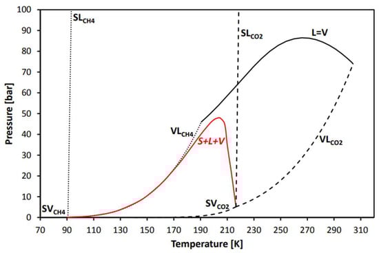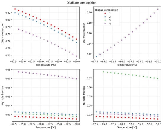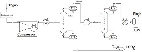 In cryogenic distillation, the biogas is first cleaned of H2S and dehydrated. If the plant aims to produce standard food-grade carbon dioxide, it is essential to remove siloxanes and VOCs as they tend to blend with liquid carbon dioxide due to their boiling point. After the initial cleaning process, the biogas is compressed to above 50 bar to exceed the pressure at which solid carbon dioxide forms, as can be seen in Figure 16. The pressurized stream is cooled prior to entering the distillation column through the heat exchanger HX-01 in Figure 17 []. After that, the biogas is introduced in the distillation column. It can be introduced in the middle, if the stream is in a two-phase state, or from the bottom, if it is in the vapor phase. The gas phase rises inside the column until reaching the condenser at the top, where it is cooled with a partial transition into the liquid phase.