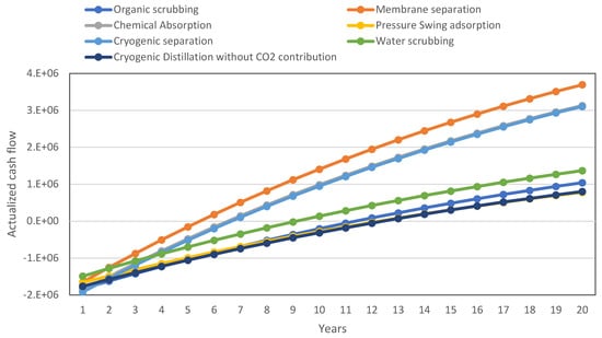There are three main methods of cryogenic separation: two include the condensation of carbon dioxide, while the third is based on its sublimation. The cryogenic distillation process and Rayan–Holmes method involve compressing biogas and lowering the temperature to take advantage of the different boiling points of methane and carbon dioxide for separation. The controlled freeze zone (CFZ) uses the solidification of carbon dioxide at atmospheric pressure to separate it from methane in the biomethane production []. The systems indicated for removing CO2 from CH4 are costly and technologically complex. They are typically adaptations of technology originally developed for natural gas refining, like the CFZ prototype created by Exxon Mobile [,].