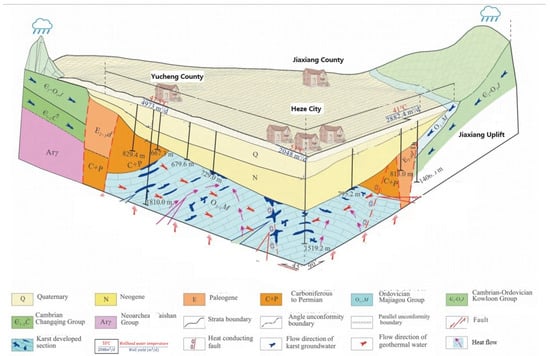 The Cambrian–Ordovician limestone geothermal reservoir is predominantly found in concealed and buried forms within the central and lateral regions of the study area. The distribution pattern of this geothermal reservoir is strictly governed by regional major faults, with Cenozoic, Mesozoic, and Paleozoic formations acting as impermeable cap layers. The depth of the Cambrian–Ordovician geothermal reservoir gradually increases from east to west, thereby influencing its temperature regime. As the depth deepens, a corresponding rise in temperature occurs. This particular type of geothermal system primarily operates through conduction.