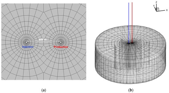 Based on the geological and thermo-physical conditions of the Cambrian–Ordovician limestone geothermal reservoir in the Heze uplift, a three-dimensional model was constructed in this study, as depicted in Figure 2. The reservoir has a depth of 2500 m and a thickness of 50 m. A doublet well system with a well spacing of 500 m is established at the center of the model. The model exhibits an almost circular shape, with its boundary located at a distance of 5 km from the doublet well system to minimize any influence on flow characteristics. Consequently, a constant boundary condition was applied. Furthermore, the heat exchange between the reservoir and cap/base rock was considered using a semi-analytical solution proposed by Vinsome and Westerveld []. Additional geometric and hydrogeological information can be found in Table 1.