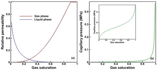 The flow equations used to describe the multiphase flow in the reservoir employs Darcy’s law. The fundamental parameters significantly influencing the multiphase flow are the relative permeability and capillary pressure. The relative permeability is a dimensionless parameter that describes the ability of a fluid phase to flow in the presence of other immiscible phases. It quantifies the fraction of the total permeability available to a specific fluid phase at a given saturation. Capillary pressure is the pressure difference across the interface between two immiscible fluids in a porous medium. It arises due to the capillary forces at the fluid–fluid interface and plays a crucial role in determining the direction and rate of fluid movement. The model adopted in this study is van Genuchten’s model [], and the parameters are listed in Table 2.
