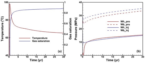 The temporal evolution of the production fluid temperature, gas saturation (a), and pressures of the two wells (b).