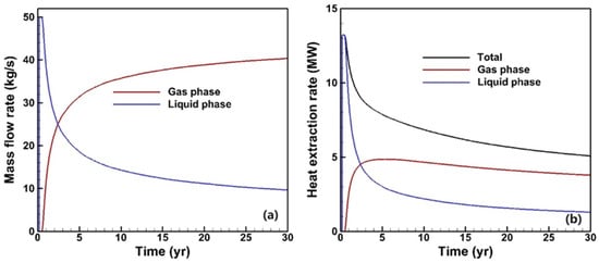Evolution of the mass flow rate (a) and heat extraction rate (b) of different phases.
