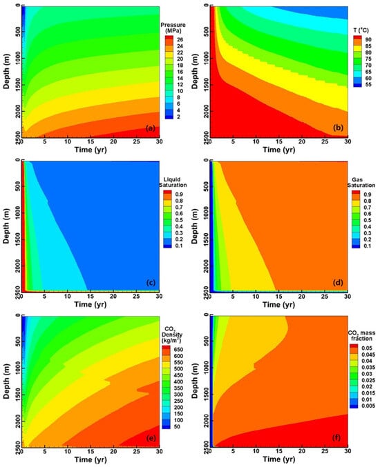 The variables monitored within the production well, including (a) pressure, (b) temperature, (c) liquid-phase saturation, (d) gas-phase saturation, (e) CO2 density, and (f) CO2 mass fraction.