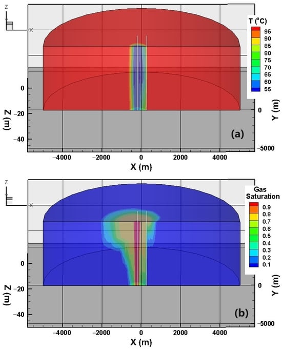 Based on Figure 4a, the displacing process can be divided into two distinct stages. Initially, within the first 0.5 years, the production fluid primarily consists of a single-phase fluid, i.e., liquid water. Subsequently, there is a rapid CO2 breakthrough, resulting in a substantial increase in gas saturation up to 0.8 after 2 years, which remains stable throughout the remaining duration of the operation. The production fluid remains in a two-phase state until the end, indicating that a phase separation process is needed for subsequent heat exchange. In Xu et al.’s study [], a well pattern of “five-spot” is adopted, and a limited reservoir volume results in a high CO2 saturation within the reservoir; this then makes the gas saturation of the production fluid approach 1 after 5 years of operation. However, in this study, implementing a doublet well pattern ensures that there is a constant influx of water into the production wellbore, thereby preventing it from reaching pure CO2 single-phase conditions. Notably, when the production fluid exists in its aqueous phase, the temperature closely approximates 100 °C. However, as the CO2 content progressively rises, the temperature experiences a rapid decline owing to the Joule–Thomson effect. Eventually, the temperature stabilizes above 65 °C.