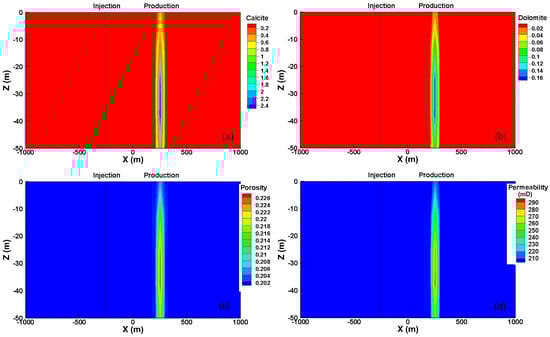 Changes in volume fraction percentage of (a) calcite, (b) dolomite, and the distribution of (c) porosity and (d) permeability after 30 years of operation.