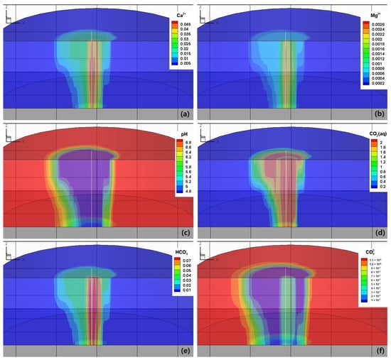 Concentration distribution of some primary species and pH in the reservoir after 30 years of operation. (a) Ca2+, (b) Mg2+, (c) pH, (d) CO2, (e) HCO3− and (f) CO32−.