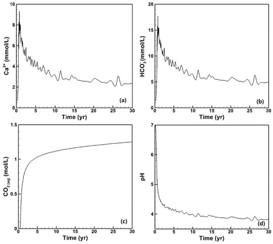 The concentrations of certain primary species are depicted in Figure 10, including Ca2+ (Figure 10a), HCO3- (Figure 10b), CO2(aq) (Figure 10c), and pH (Figure 10d). Upon CO2 breakthrough, the concentrations of Ca2+, Mg2+, and HCO3− instantaneously increase to approximately ten times their initial values, followed by a gradual decrease with minimal fluctuations. Simultaneously, the concentration of dissolved CO2 rises while the pH consistently declines.