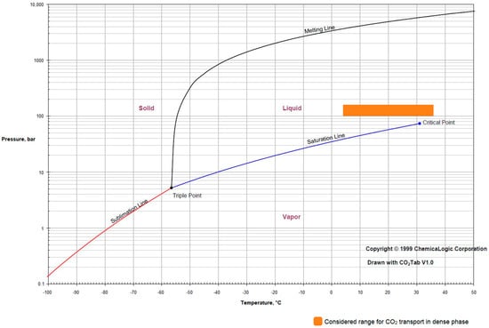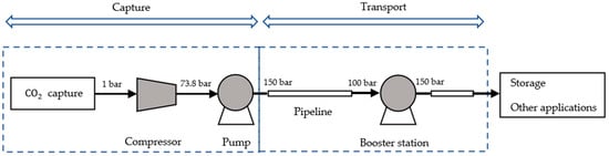 After the initial capture, CO2 initially exists in the gaseous phase. It is then processed through a compressor, where it reaches its critical pressure of 73.8 bar. The critical point is a thermodynamic state where distinct liquid and gas phases of do not exist; rather, it exists as a supercritical fluid which exhibits the properties of both phases. Subsequently, a pump elevates the pressure to 150 bar, transitioning it to a dense phase, which is ideal for pipeline transport due to its high density and low viscosity []. As CO2 traverses through the pipeline, its pressure gradually decreases due to various factors such as frictional losses, elevation changes, and temperature differentials along the pipeline route. To counteract this and to maintain the necessary pressure for transport, one or multiple booster stations along the pipeline repressurize the CO2 back to 150 bar. Ultimately, the CO2 reaches its destination, where it can be utilized in various ways. This may involve underground storage, utilization in processes such as enhanced oil recovery, manufacturing applications, or even in the food and beverage industry for carbonation processes. The block diagram in Figure 1 illustrates the sequential steps involved in the transportation and utilization of CO2 [].