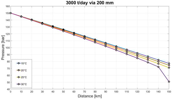 One of the main reasons for calculating the pressure drop in the pipelines is to determine the optimal location for booster stations. This is crucial for ensuring that CO2 can be transported in the dense phase without undergoing a phase change. This also ensures effective and efficient transportation. In the methodology, a flow temperature of 30 °C has been assumed. There will likely be a decrease in temperature along the length of the pipeline. However, a conservative approach is adopted for calculations. Therefore, a flow temperature of 30 °C is used to calculate the pressure drop in the pipeline. Figure 3 shows the pressure drop along the pipeline with various flow temperatures, considering a pipeline with 200 mm diameter and transporting 3000 t/day. The slight increase in pressure loss observed at a flow temperature of 30 °C demonstrates the conservative approach of assuming the flow temperature. Additionally, the notable dip in pressure observed for the flow at 30 °C is attributed to the phase change occurring within the pipeline. However, a booster pump will be used well before a phase change takes place.