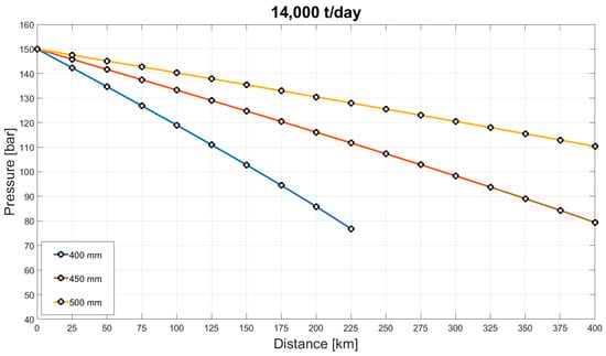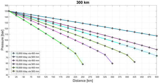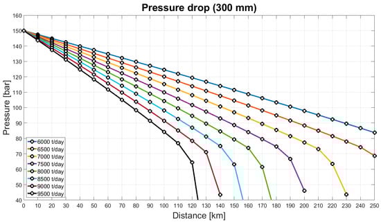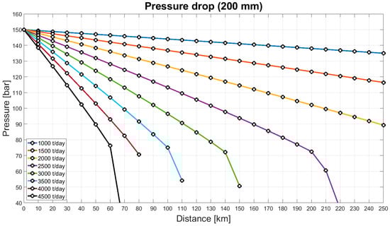 Figure 4 and Figure 5 show the pressure drop for different mass flow rates in a pipeline with 200 mm and 300 mm diameter, respectively. Given that the cutoff pressure for a phase change of CO2 with a temperature of 30 °C is at 73.8 bar, theoretically allowing pressure to drop to 80 bar before requiring a booster pump is feasible. However, due to the high cost associated with converting CO2 from gas to the dense phase, a more conservative approach is adopted. Consequently, the allowable minimum pressure is set at 100 bar.