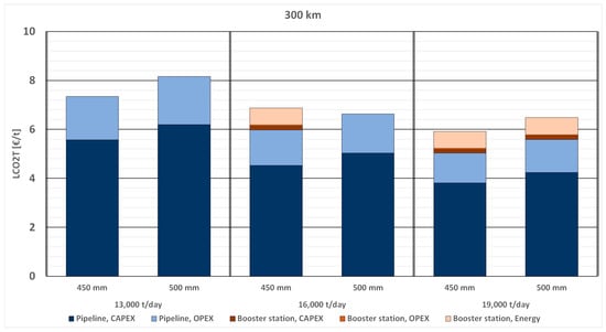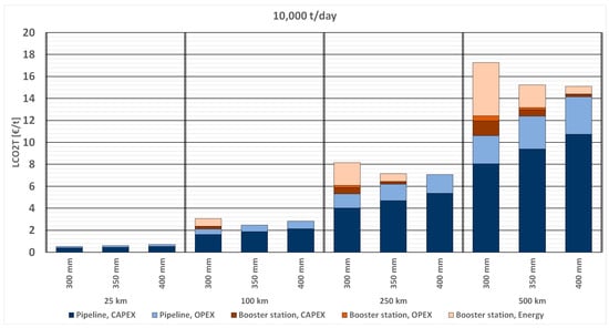 Figure 6 presents a detailed cost breakdown for transporting 10,000 t/day using three different pipeline diameters: 300 mm, 350 mm, and 400 mm. Costs are depicted for four different distances. The LCO2T comprises pipeline capital expenditure (CAPEX), pipeline operational expenditure (OPEX), booster station CAPEX, booster station OPEX, and energy costs required for the booster stations.