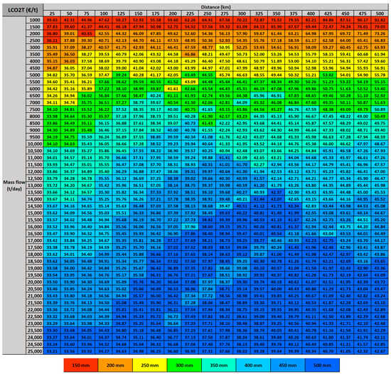 Figure 7 presents a detailed table of costs for different mass flows and transport distances, providing a more specific breakdown of the expenses involved in CO2 transportation. The total LCO2T ranges from 0.35 €/t to 55.82 €/t, depending on the mass flow and distance. The LCO2T encompasses all costs associated with the transport infrastructure, excluding the costs of the initial compressor and pump.