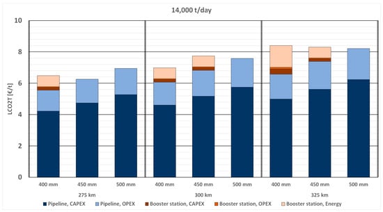 To address the fluctuation of the least LCO2T across different pipeline diameters for a specific mass flow rate, it becomes necessary to examine a detailed cost breakdown for a particular case. Figure 9 provides a comprehensive breakdown of costs for a mass flow rate of 14,000 t/day over three different distances: 275 km, 300 km, and 325 km, where the least LCO2T varies across three distinct pipeline diameters. The Pipeline CAPEX and OPEX demonstrate an increase with both the length of the pipeline and its diameter. Furthermore, booster station costs notably impact the overall levelized costs. As depicted in Figure 10, a pipeline with a 400 mm diameter requires a booster station every 150 km, while a pipeline with a 450 mm diameter needs one every 275 km. In contrast, a pipeline with a 500 mm diameter necessitates no booster stations up to a distance of 325 km.