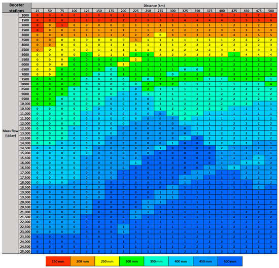 The pumps placed along the length of the pipeline to overcome the pressure loss in the pipeline are called booster stations. The costs associated with booster stations are calculated in a similar way to the previous section (Section 2.2). However, to calculate the number of booster stations required along the way, the exact pressure drop along the pipeline has to be calculated. In the literature, the distance at which a booster station is placed is usually assumed to be between 70 km and 150 km []. In some cases, a pressure drop of 0.5 bar/km to 1.5 bar/km [,] or an allowable pressure drop of 50–70 bar [,] along the total length of the pipeline is assumed. However, in this research, the exact distance at which a booster pump is required has been derived by calculating the pressure drop along the length of the pipeline. This helps to determine the number of booster stations and at which exact distance they are required along the length of the pipeline.