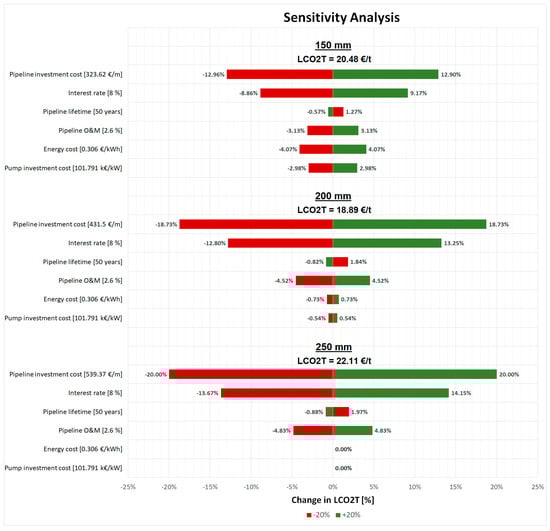 Meeting Germany’s climate targets urgently demands substantial investment in renewable energies such as hydrogen, as well as tackling industrial CO2 emissions with a strong CO2 transport infrastructure. This is particularly crucial for CO2-heavy industries such as steel, cement, lime production, power plants, and chemical plants, given Germany’s ban on onshore storage. The CO2 transport network is essential for maintaining a circular economy by capturing, transporting, and either storing or utilizing CO2. This study fills gaps in CO2 pipeline transport research, examining pipeline diameters, costs, and pressure drop, and providing sensitivity analysis. Key findings show that the levelized cost of CO2 transport (LCO2T) ranges from 0.25 €/t to 55.82 €/t based on varying transport masses (1000 t/day to 25,000 t/day) and distances (25 km to 500 km), with compression costs pushing LCO2T to 33.21 €/t to 92.82 €/t. Analyzing eight pipeline diameters (150 mm to 500 mm) and the impact of CO2 flow temperature on pressure loss highlights the importance of selecting optimal pipeline sizes. Precise booster station placement is also crucial, as it significantly affects the total LCO2T. Exploring these areas can offer a more thorough understanding of the best strategies for developing cost-effective, efficient, and sustainable transport infrastructure.