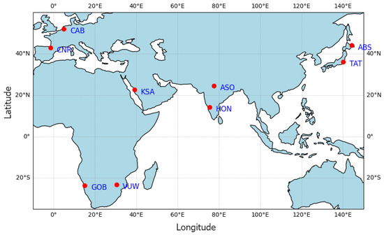 In this study, data were collected from various solar monitoring stations located across several different countries, including Cabauw, in the Netherlands; Cener, in Spain; Abashiri and Tateno, in Japan; Gobabeb, in Namibia; USAid Venda, in South Africa; and Saudi West Coast, in Saudi Arabia. Ground data were sourced from different networks, such as the World Radiation Monitoring Center–Baseline Surface Radiation Network (BSRN—https://bsrn.awi.de/, accessed on 19 April 2024) [5] and the Southern African Universities Radiometric Network (SAURAN—https://sauran.ac.za/, accessed on 19 April 2024) [28] (https://dataportals.pangaea.de/bsrn/stations, accessed on 19 April 2024), while some stations utilized SCADA (Supervisory Control and Data Acquisition) systems for ground data collection. The details of metadata of the locations used in the present study have been given in Table 1.