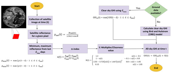 Flowchart showing the algorithms used for the all-sky GHI estimation using Heliosat-2.