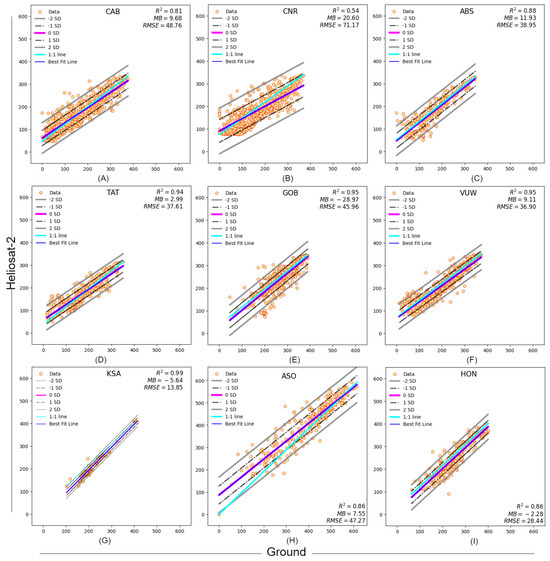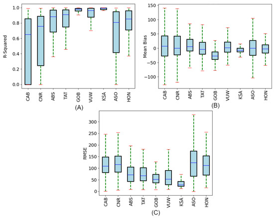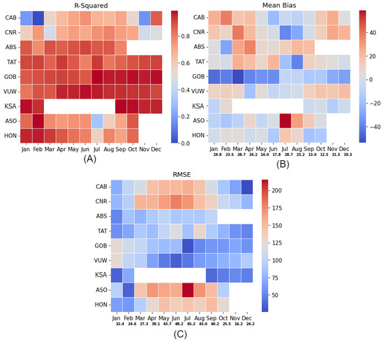 In African regions, such as GOB and VUW, the R2 values remain exceptionally high throughout the year, particularly from July to November, frequently surpassing 0.92. The RMSE values, however, are higher during warmer months (January, February, March, and December) and lower during cooler months (July, August, and September). GOB consistently shows a trend of underestimation, which is attributed to reflective desert surfaces. VUW exhibits a general overestimation, one influenced by seasonal vegetative changes affecting ground albedo [59,60].