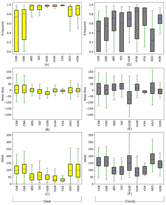 The highest RMSE for clear sky was observed in the CNR location, with a median value of 108.6 W·m−2. In contrast, clear days presented lower RMSE values for both Japanese locations, averaging a median of 52.5 W·m−2 (Figure 5C). In African locations, particularly on clear days, the median RMSE value hovers around 41.6 W·m−2, with both GOB and VUW exhibiting similar error bars, ranging from approximately 7 to 115 W·m−2. In the KSA site, the RMSE values were notably lower, ranging from 16.2 W·m−2 to 58.7 W·m−2 (Figure 5C). The Indian locations showed the highest variability of RMSE values (0 to 250 W·m−2) under clear-sky conditions among all the locations analyzed in this study.