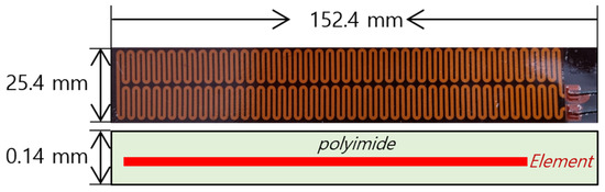 Figure 1 shows the external appearance and dimensions of the film heater for satellite applications used in this study. The film heater measured 152.4 × 25.4 mm, with a thickness of 0.14 mm. Silver paste was printed onto a polyimide film insulator using gravure-printing technology. The silver paste served as the heating element and was densely arranged in curves. The heating element was designed to be 1 mm wide and 1817 mm long, excluding the connectors. This specification is a commonly used size. When printed using screen-printing technology, the designed thickness of the silver paste ranged from 1 to 5 μm. Because of its extremely thin profile, the thickness was measured using scanning electron microscopy (SEM) after sectioning the sample. These measured specifications of the film heater facilitated the development of a three-dimensional (3D) model for the thermal analysis simulation.