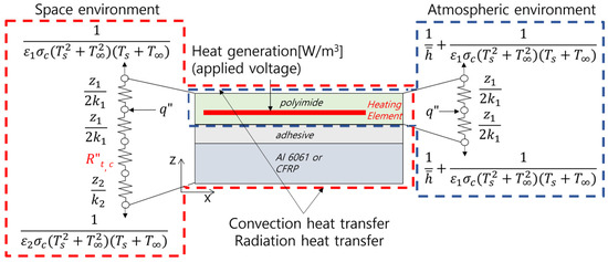 A thermal analysis was performed using an Ansys 18.2 thermal–electric model under steady-state conditions. Figure 2 shows the boundary conditions of the thermal simulation. When electrical energy was applied to the heating element, it was converted to thermal energy. The generated heat was transferred by conduction through the polyimide film and then exited via convection and radiation heat transfer at the external surface. The vertical thermal resistance of the film heater is shown in Figure 2. Here, denotes thermal conductivity, denotes the emissivity of the material, denotes the Stefan–Boltzmann constant, denotes the surface temperature, denotes the ambient temperature, and denotes the convective heat transfer coefficient, where subscript 1 denotes the polyimide film and subscript 2 denotes CFRP and Al 6061. The atmospheric boundary condition was that convection and radiation heat transfer only occurred outside the film heater. The mesh size of the heating element was 0.3 mm, that of the external film was 0.7 mm, and the total number of elements was 132,982. The space-environment boundary conditions simulated the actual application of the film heater on a satellite. The heater was modeled on a substrate measuring 250 × 250 mm, with a thickness of 2 mm. The mesh size of the substrate was 0.001 m and the total element count was 261,934. In satellite applications, no convection occurs and thermal radiation exists at the surface. The thermal contact resistance due to the adhesive (t,c) was obtained from previous studies [11]. t,c was m2K/W when the film heater was attached to CFRP or m2K/W when the film heater was attached to Al 6061. The material properties of all substances are listed in Table 1. However, the resistivity of the silver paste was inputted using varying values, depending on the temperature and based on experimental results.