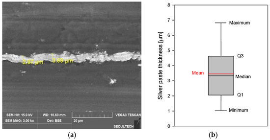 Cross-sectional image of film heater captured via SEM alongside a graph displaying the thickness data of silver paste in box-plot format: (a) film heater cross-sectional SEM image; (b) box plot of data for 26 heating-element thicknesses.