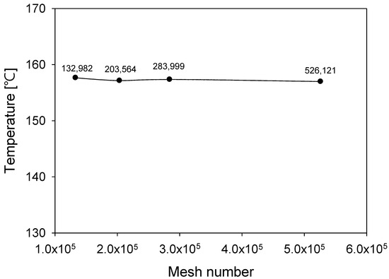 Figure 4 shows the mesh validation for the 3D model of the film heater. The maximum temperature of the heater at a mesh number of 132,982 changed by less than 1% as the mesh number increased. Therefore, increasing the mesh number over 132,982 did not significantly affect the results.