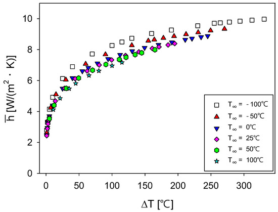 Figure 5 shows the variations in the convective heat transfer coefficient with the temperature difference between the heater-surface and ambient temperatures. These coefficients were calculated using Equations (11)–(13). The temperature difference, denoted as , was defined by . Because of free convection, the range of these coefficients did not exceed 25 W/(m2K) [18]. The ambient temperature was calculated at six points, ranging from −100 C to 100 C. The ranges of the temperature differences varied with the ambient temperature. Considering the durability of the film heater, calculations for heater-surface temperatures above 250 C were not performed. The convective heat transfer coefficient nonlinearly increased with the temperature difference. This coefficient rapidly rose at lower temperature differences and was less affected by the external temperature, resulting in closely packed values. As the temperature difference increased, the rate of increase in the convective heat transfer coefficient gradually decreased and the influence of the external temperature became more significant. Consequently, as the external temperature increased, the convective heat transfer coefficient decreased. This phenomenon was due to the variation in the average temperature that determined the fluid properties (viscosity, thermal conductivity, etc.), which was the mean of the heater-surface and external temperatures.