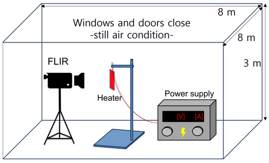 To measure the temperature coefficient of resistance, the resistance and temperature of the film heater were first measured at an arbitrary reference voltage. As the voltage increased, the resistance of the heater was measured and the temperature coefficient of resistance could be calculated using Equation (1). Figure 6 shows a schematic of the experimental setup used to measure the temperature coefficient of resistance of the heater. The experiments were conducted in a room measuring 8 × 8 m and 3 m in height. The initial temperature was 25 C. The experimental space maintained still-air conditions. The film heater was vertically mounted using clamps. A DC power supply was used to energize the film heater, starting at 20 V and increasing in increments of 10 V. The heater temperature was monitored using an FLIR camera (FLUKE-TiS75+, Fluck Corporation, Everett, WA, USA) after allowing the temperature to stabilize for 10 min following each voltage application. The experiment concluded when the maximum heater temperature approached 200 C, with a final voltage of 105.2 V. The resistance at each voltage level was calculated using the voltage and current displayed on the DC power supply, following Ohm’s Law.