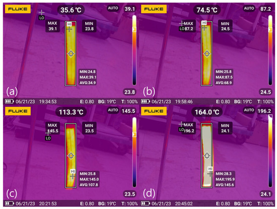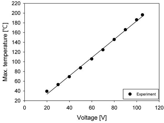 Figure 7 and Figure 8 show the thermal images captured using an FLIR camera and the corresponding maximum temperature changes of the film heater and applied voltages, respectively. Figure 7 includes thermal images of the film heater at applied voltages of (a) 20 V, (b) 50 V, (c) 80 V, and (d) 105.2 V. The maximum temperatures of the heater at these voltages were 39.1 , 87.5, 145.5 , and 196.2 , respectively. Conversely, the minimum temperatures remained close to the ambient temperature (25 C), similar to the nonheating sections of the film heater, because of the low thermal conductivity of the polyimide film. The maximum temperatures of the film heater were used as the temperature data to calculate the temperature coefficient of resistance. Figure 8 shows the variation in the maximum temperatures of the film heater and the voltage. A linear curve fit was applied, yielding an value of 0.9973. The curve-fitting results indicated that the maximum temperature of the film heater linearly increased with the voltage.