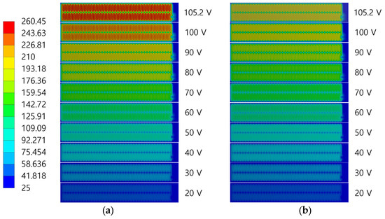 To investigate the effect of the temperature coefficient of resistance in thermal analysis simulations, two simulations were performed: one with the temperature coefficient applied and the other without. Figure 10 shows the temperature distributions of the film heater for both simulations. The simulations used the atmospheric boundary conditions shown in Figure 2. The ambient temperature was 25 , which was identical to the experimental setup. The voltage was incrementally increased from 20 V in 10 V steps to a final voltage of 105.2 V. The convective heat transfer coefficients were obtained from the data presented in Figure 5 at an external temperature of 25 . Detailed values are presented in Table 2. Figure 10a shows the temperature distribution without the application of the temperature coefficient of resistance and Figure 10b shows it with the temperature coefficient of resistance. The edges of the heater and areas without heating elements maintained lower temperatures, which was consistent with the experimental results. However, the temperature distribution without the temperature coefficient of resistance (Figure 10a) exhibited larger variations with an increase in voltage than that with the temperature coefficient of resistance (Figure 10b). For a quantitative assessment, the maximum temperatures of the film heater were compared.