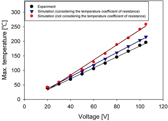 Figure 11 shows the maximum temperatures of the film heater and the applied voltages depicted for the experiment (black), the simulation with the temperature coefficient of resistance applied (blue), and the simulation without the temperature coefficient of resistance applied (red). The experimental data were obtained from Figure 8. Typically, the maximum temperature of the film heater linearly increased with the voltage, even though differences in the slopes were observed. The results with the temperature coefficient of resistance applied showed a smaller slope than those without. Even if the same voltage was applied, the resistance of the heater increased because of the temperature coefficient of resistance and, finally, the output (heater temperature) decreased. Therefore, these results were consistent with the experimental results. When comparing the simulation results with the temperature coefficient of resistance and the experimental data, the temperature differences were 2.54 °C at 20 V and 19.34 °C at 105.2 V. Conversely, when comparing the simulation without the temperature coefficient of resistance with the experiment, the temperature differences were 2.86 °C at 20 V and 62.4 °C at 105.2 V. The application of the temperature coefficient of resistance reduced the simulation error from 22.5% to 10.0%. This demonstrates the necessity of using the temperature coefficient of resistance in the thermal simulations of electrical heaters.