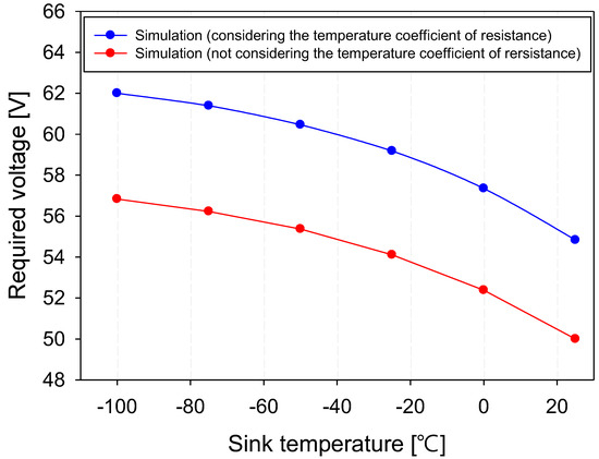 Simulations can predict the output of film heaters based on the use environment. However, as shown in Figure 11, neglecting the temperature coefficient of resistance can lead to significant simulation errors, potentially resulting in the following scenarios: the film heater could fail because of an overload caused by an incorrect design voltage; critical damage could occur to components; or the internal equipment could fail because of exposure to low temperatures caused by an insufficient output. Therefore, this study analyzed the effect of the temperature coefficient of resistance on predicting the output of film heaters in a space environment. The space environment was assumed to be a vacuum at various sink temperatures of 25 , 0 , −25 , −50 , −75 , and −100 . Figure 12 shows the maximum temperature changes of the film heater and the applied voltage. These changes were the results of simulations under space-environment boundary conditions with the temperature coefficient of resistance applied (blue) and not applied (red). In the space environment, convective heat transfer conditions were omitted and the film heater existed in isolation. The maximum temperature of the film heater linearly increased with the voltage. As the sink temperature decreased, the maximum temperature of the film heater decreased at the same voltage. However, the rate of decrease was not constant and it diminished. In extremely cold regions, the sink temperature had less of an effect on the maximum temperature of the film heater. The rate of increase in the maximum temperature was smaller for the simulation with the temperature coefficient of resistance applied than that without because an increase in resistivity with temperature led to a lower output. At a voltage of 57.5 V, the expected maximum temperature of the heater was, on average, 11.54% higher when the temperature coefficient of resistance was not applied. Not considering the temperature coefficient of resistance could lead to an underestimation of the output of a heater during the thermal-design stage, potentially failing to maintain the proper temperature of electronic devices. The voltages required to reach the control temperature at different sink temperatures was calculated, as shown in Figure 12. The control temperature was set to 150 C, indicated by a red line in the figure. The intersection points on the x-axis (voltage) of the maximum temperature data and the control temperature indicate the voltages required to achieve the control temperature at each sink temperature.