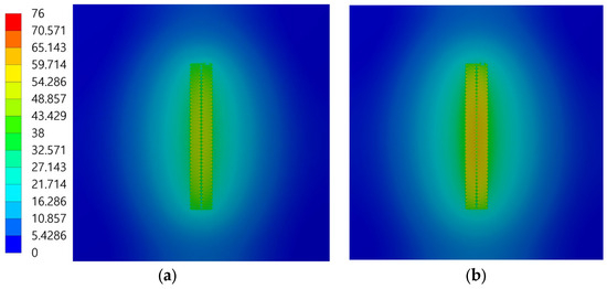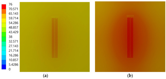 Figure 16 shows the temperature contours obtained from a simulation in which the film heater was attached to an Al 6061 substrate. The boundary conditions and sink temperature were the same as those used in Figure 14. Figure 16a shows the temperature contour with an applied voltage of 52.38 V, which did not consider the temperature coefficient of resistance. Figure 16b shows the temperature contour with an applied voltage of 57.35 V, which considered the temperature coefficient of resistance. Because of the higher thermal conductivity of Al 6061 than CFRP, the temperature variation was less pronounced. The temperatures across the film heater and substrate were more uniform, with the maximum and minimum temperature differences not exceeding 8 C. The maximum temperature of the film heater without the temperature coefficient of resistance was 67.07 C, whereas it was 75.954 C with the coefficient applied, indicating that the differences in heater output were due to the varied applied voltages. Similar to CFRP, the maximum temperatures of a film heater and an Al 6061 substrate may differ. Therefore, the substrate temperature was separately analyzed.