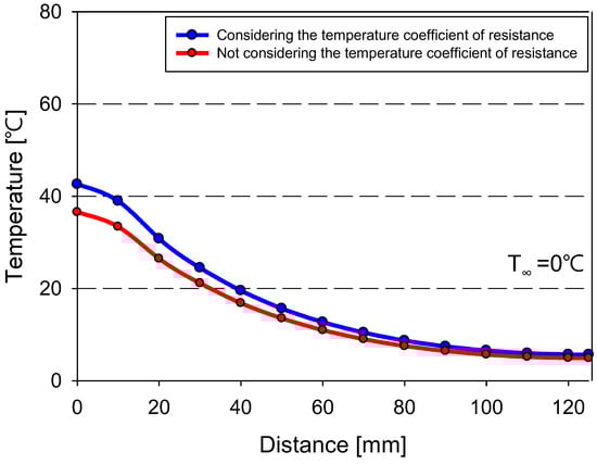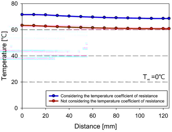 Figure 17 shows the temperature distribution of Al 6061 and the distance from the center of the substrate, extracted from the data presented in Figure 16. The location for temperature extraction was the same as that in Figure 15. Because of the high thermal conductivity of Al 6061, the temperature variation was minimal. When the temperature coefficient of resistance was used (blue), the maximum temperature of Al 6061 was 71.553 C compared with 63.328 C obtained when the coefficient was not used (red). Unlike CFRP, the temperature difference between the conditions with and without the temperature coefficient of resistance applied remained constant regardless of the distance from the center. The higher the thermal conductivity of the substrate, the greater the effect of the temperature coefficient of resistance on the substrate temperature predictions. At a sink temperature of 0 C, the difference between the control temperature of the film heater and the maximum temperature of the substrate was 107.4 C for CFRP and 78.5 C for Al 6061. However, if the temperature coefficient of resistance was not considered, this temperature difference became even larger, significantly complicating the prediction of substrate temperatures.