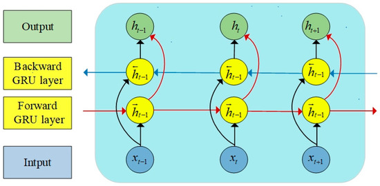 Because of the strong temporal characteristics inherent in wind power load data, information corresponding to both the previous time step (t − 1) and the current time step (t + 1) significantly impact the prediction results at time t during model training. Consequently, the GRU model fails to fully exploit the inherent information within wind power sequences. In contrast, the Bidirectional Recurrent Neural Network (BiGRU) model addresses this limitation by utilizing both past and future data to enhance prediction accuracy. This effectively overcomes the drawback of low data information utilization observed in the GRU network. Comprising two GRU models, BiGRU possesses the capability to capture bidirectional dependencies within sequential data, thereby enabling it to adapt to more complex sequence patterns. The network structure is visually depicted in Figure 2.