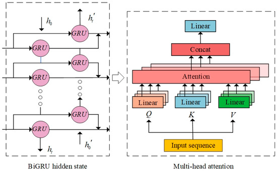 Although BiGRU performs effectively in handling wind power sequences, it lacks the ability to parallelize data processing, resulting in information overload and reduced computational efficiency when dealing with large datasets. To address this limitation, this study combines BiGRU with the multi-head attention mechanism (MHA), as depicted in Figure 3. This integrated model architecture effectively resolves the aforementioned issue. The core process involves utilizing the data trained through the BiGRU hidden layers as input for the MHA network. The decomposed Q, K, and V obtained are then fed into each head for attention value computation. Subsequently, the different results outputted from each channel are feature-weighted and concatenated through a connection layer to form the sequence.