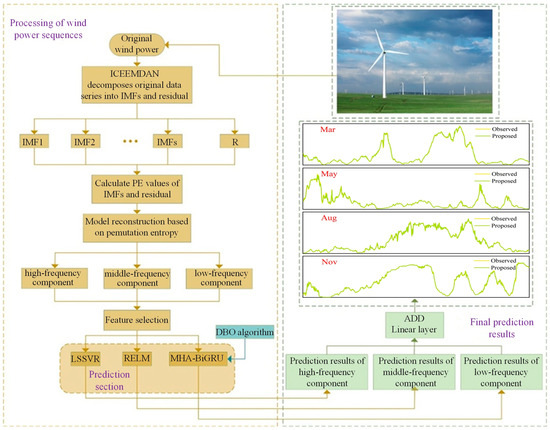 Wind energy is an environmentally friendly and economically viable form of renewable energy. According to the Global Wind Energy Council (GWEC)’s Global Wind Report 2023, global onshore wind power capacity is projected to exceed 100 GW for the first time by 2024 [1]. However, wind energy data exhibit significant randomness and non-stationarity, which has a substantial impact on the stable operation of power systems. Therefore, accurate prediction of wind power is crucial [2,3,4].