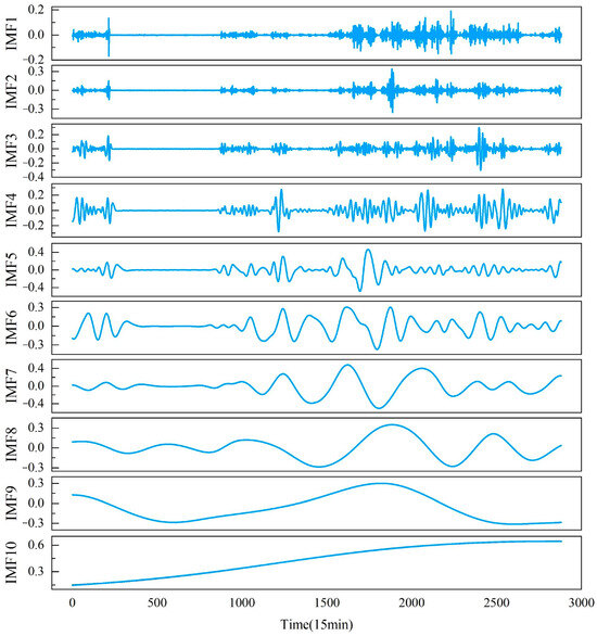 Wind power data are inherently characterized by randomness and non-stationarity, necessitating data preprocessing to mitigate prediction errors effectively. To address this, scholars have proposed methodologies grounded in signal decomposition for model formulation. For instance, Gao et al. [24] introduced a composite model combining Empirical Mode Decomposition (EMD) with GRU for prediction tasks. However, the EMD algorithm encounters notable challenges such as mode mixing when confronted with gapped signals. In response, scholars have advocated for the incorporation of uniformly distributed white noise into EMD, manifesting as Ensemble Empirical Mode Decomposition (EEMD) and Complementary Ensemble Empirical Mode Decomposition (CEEMD). This technique has found widespread adoption within the prediction domain. For instance, Torres et al. [25] argued that inadequate decomposition processing frequencies may lead to the persistence of white noise’s influence and the emergence of pseudo-mode phenomena. Consequently, they proposed Complementary Ensemble Empirical Mode Decomposition with Adaptive Noise (CEEMDAN), effectively mitigating residual white noise’s impact. Addressing residual noise and pseudo-mode concerns further, Colominas et al. [26] introduced Improved Complementary Ensemble Empirical Mode Decomposition with Adaptive Noise (ICEEMDAN), demonstrating heightened reconstruction accuracy for components and enhanced suitability for nonlinear signal analysis.