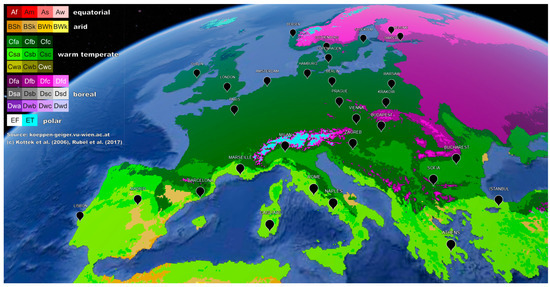 - Kottek, M.; Grieser, J.; Beck, C.; Rudolf, B.; Rubel, F. World Map of the Köppen-Geiger Climate Classification Updated. Meteorol. Z. 2006, 15, 259–263. [Google Scholar] [CrossRef]