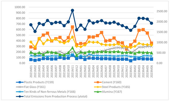 Following the design and calculation steps of the “Electricity–Energy–Carbon” model for production processes, models were built using product output data from various sub-industries. Optimal models were achieved for 53 industries. With these models, monthly product output data across various industries was computed. To estimate the carbon emissions during the production processes of these products, carbon emission parameters for 53 industry products were collected, all based on the publicly available literature and data sources. By combining the product carbon emission parameters with the production data, the carbon emissions for each industry’s production process were calculated, as shown in Table A3 (given in Appendix C).