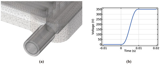 Preprocessing of electro–thermo–fluidic simulation: (a) meshed elements zoomed-in around the coolant inlet and (b) Sigmoid-based step voltage input function.