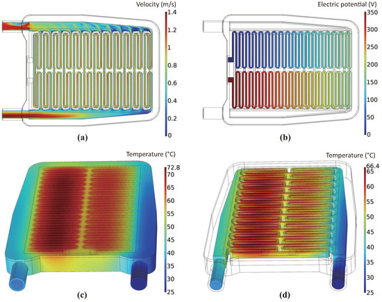 Figure 3 depicts the post-processed simulation graphics for the flow rate case of 10 LPM, which is equivalent to . Figure 3a shows a color contour plot of the velocity field in a cross-section at the middle height of the serpentine channel. The coolant enters through a single-channel inlet and flows in parallel through twelve symmetric serpentine branches within the heater body. In the last two branches, furthest from the inlet and subject to reduced hydraulic pressure, the flow speed decreases. However, no flow blockages have been observed in these channels. It is important to note that blocked channels could result in inadequate convective cooling during heater operation, potentially causing temperature-induced boiling, high vapor pressure, and subsequent damage or explosion of the heater. Figure 3b displays the steady-state electric potential field when a step voltage of 350 V is applied to the screen-printed TFE along the channel walls. A consistent voltage drop is observed from the electrical input port to the ground electrode. Figure 3c,d depict the temperature distribution outside the entire heater region and the fluid region, respectively, at 60 s. With a flow rate set at 10 LPM, it was estimated that the highest temperature at the heating element reached 72.8 °. The average temperature in the outlet cross-section of the fluid region was determined to be 34.4 °, which is 9.4 ° above the inlet temperature of 25 °.