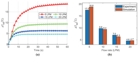 Time-dependent thermal analysis results: (a) temperature difference versus time curve for different coolant flow rates, with data points collected every 2 s; (b) bar graphs comparing simulated and experimental results for steady-state temperature increase from inlet to outlet.