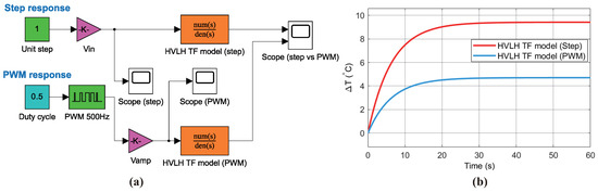 Figure 7 shows an example of the block diagram model along with its dynamic analysis results, derived from the transfer function formulated by successive simulation, modeling, and regression analysis of the symmetric serpentine-type HVLH schematic, illustrated in Figure 1. The block diagram example shown in Figure 7a was established to analyze the step response to a 350 V voltage and to explore the performance of the popular PWM control technique [30], which is noted for its effectiveness in managing and mitigating overheating in sustained high-voltage environments. Figure 7b shows the HVLH response to a step input signal, equivalent to a PWM signal in a full duty cycle of 100%, and predicts the transient evolution of in a lower duty cycle of 50%. Upon integrating the HVLH as an electric heating component within an HVAC system, the insights gained from the transfer function modeling, as detailed in this study, are crucial for developing control strategies at the system-wide level and for predicting heater performance through block diagram modeling techniques.